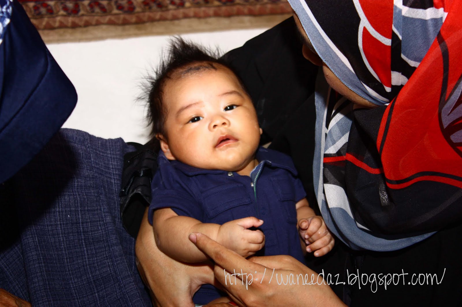 Majlis cukur jambul Hariz was held last Sunday at my parents'. Right before we left to Penang. We didn't really shave his hair's bald. Just potong sikit-sikit je. I don't know the rituals here in Alor Setar, but Hariz's hair was cut in many different places. Habis lompong-lompong rambut die. And then , the mak bidan sapu kapur to our faces, mommy and Hariz.